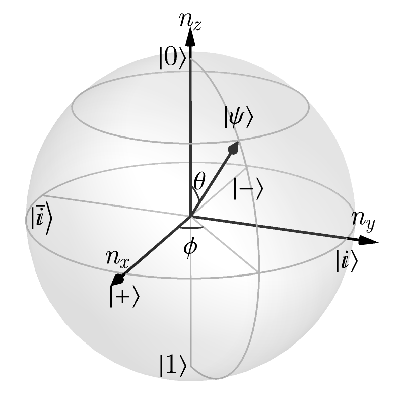 where \(\theta \in [0, \pi]\) and \(\phi \in [0, 2\pi)\). Normalization is automatic: \(\cos^2(\theta/2) + \sin^2(\theta/2) = 1\).