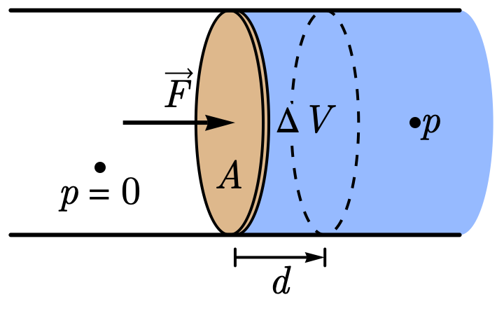 What kind of energy? Imagine a piston pushing a volume \(\Delta V\) of fluid through a pipe. Work done = \(F \cdot d = (pA) \cdot d = p \cdot \Delta V\). So pressure = work per unit volume—the potential energy a fluid has to expand and do work. High-pressure fluid is like a compressed spring: it carries stored capacity to do work even when stationary.