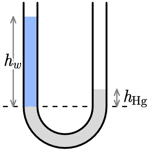 Fig. 4 U-tube manometer with water (height \(h_w\)) and mercury (height \(h_{\text{Hg}}\)).#