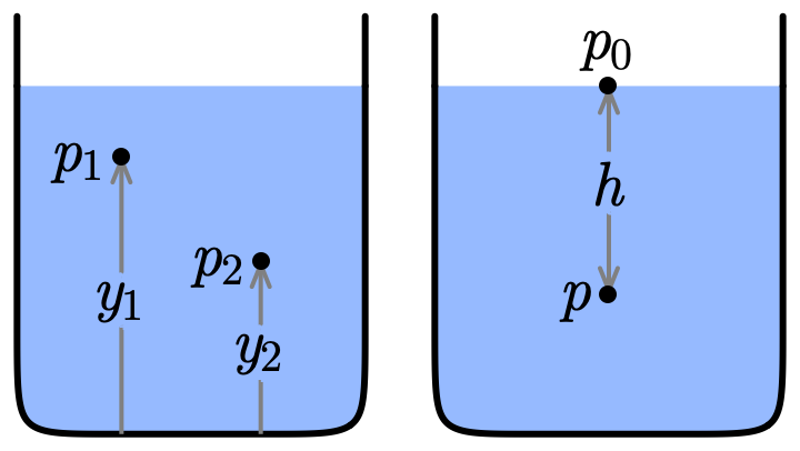 Depth below surface: If level 1 is the surface (\(p_1 = p_0\), atmospheric) and level 2 is at depth \(h\) below it (\(y_2 = -h\)):