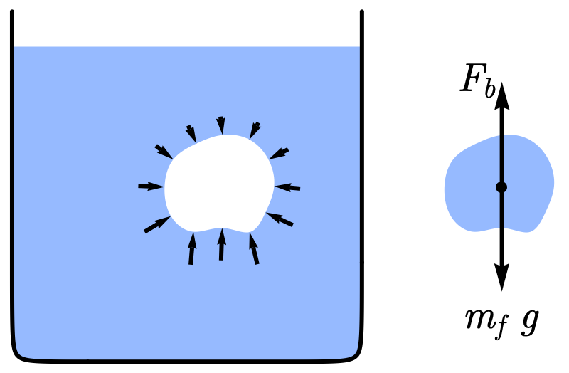 Archimedes’ principle: \(F_b = m_f g\), where \(m_f\) is mass of fluid displaced