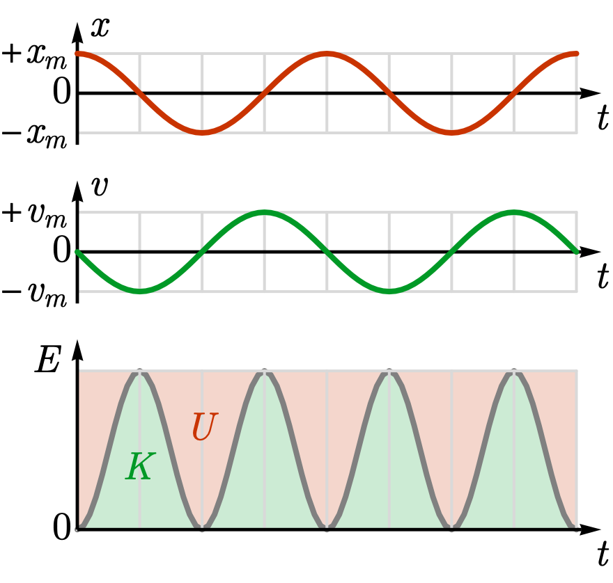 Versus position \(x\): \(U(x) = \frac{1}{2}kx^2\) is a parabola; \(K(x) = E - U(x)\) is the complement. At \(x = 0\) the energy is all kinetic; at \(x = \pm x_m\) it is all potential.