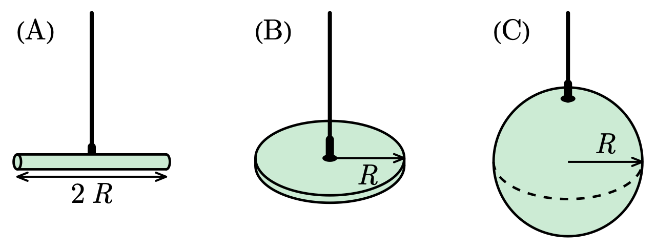 Three objects—a thin rod, a flat disk, and a ball—are each hung in turn from the same torsion wire (one at a time). All have the same mass and the same characteristic size (e.g., rod length = 2\(R\), disk and ball radius = \(R\)). When oscillating, which has the longest period?
