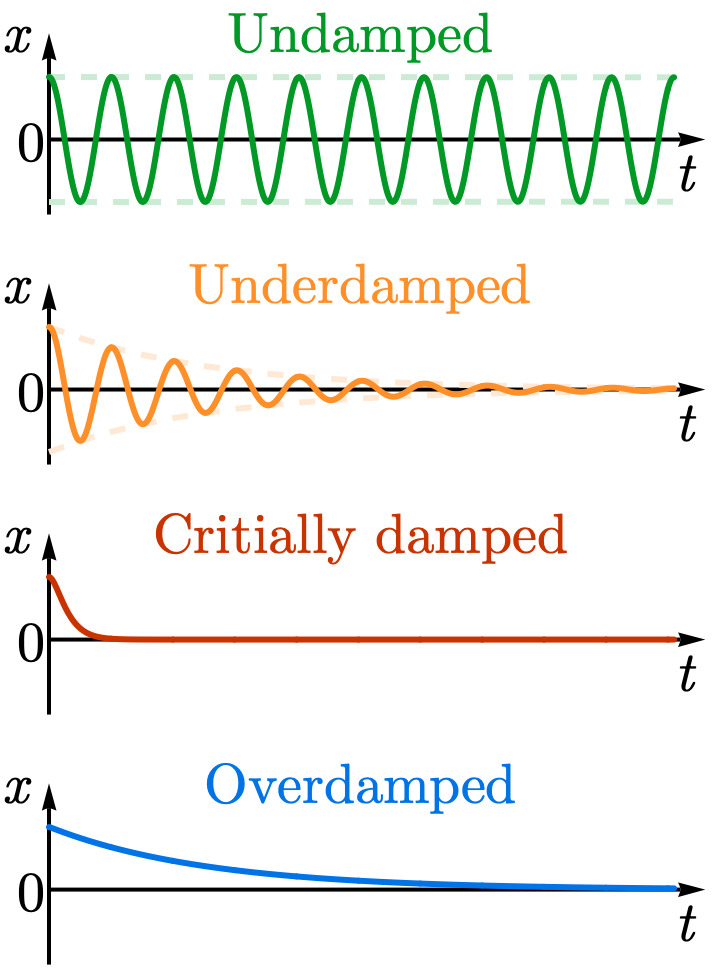 (79)#\[ \omega' = \sqrt{\omega^2 - \frac{1}{4\tau^2}} \]Undamped: If \(b = 0\): \(\tau \to \infty\), \(\omega' = \omega = \sqrt{k/m}\).
