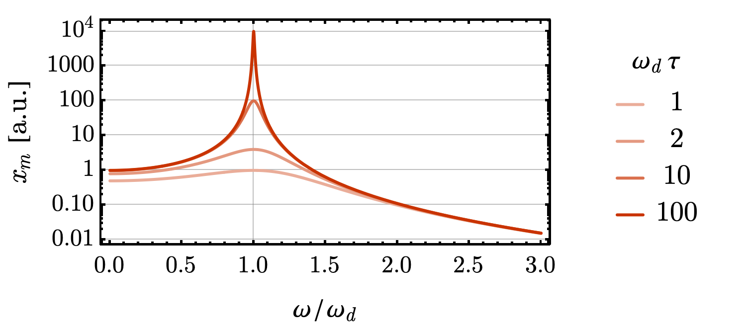 Fig. 17 Amplitude \(x_m\) versus \(\omega_d/\omega\) for different damping levels. The peak is near \(\omega_d \approx \omega\). Less damping → taller, narrower resonance peak.#